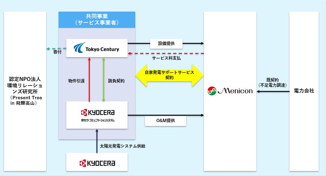 株式会社メニコン(本社:愛知県名古屋市、代表執行役社長:田中 英成、以下「メニコン」)と、東京センチュリー株式会社(本社:東京都千代田区、代表取締役社長:馬場 高一、以下「東京センチュリー」)、京セラコミュニケーションシステム株式会社(本社:京都府京都市、代表取締役社長:黒瀬 善仁、以下「KCCS」)は、SDGs(持続可能な開発目標)の達成に資する、寄付型のコーポレートPPA(自家発電サポートサービス)のサービスを開始いたしましたので、下記のとおり、お知らせします。