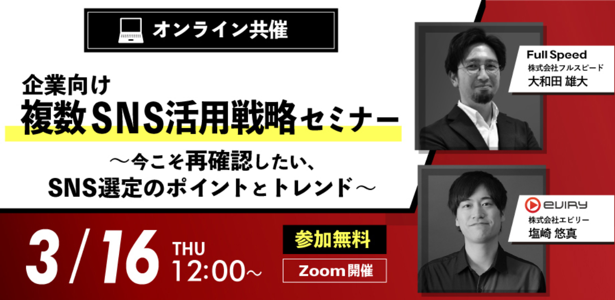 このたび、SNSの最前線でマーケティング活動を支援しているフルスピード社とYouTubeマーケティングをはじめとした動画マーケティングの最前線で支援を担うエビリー社の2社でオンラインセミナーを開催します。テーマはYouTubeやTikTokによる動画活用を含めた、複数SNSの活用戦略設計とトレンドについてお話しします。
