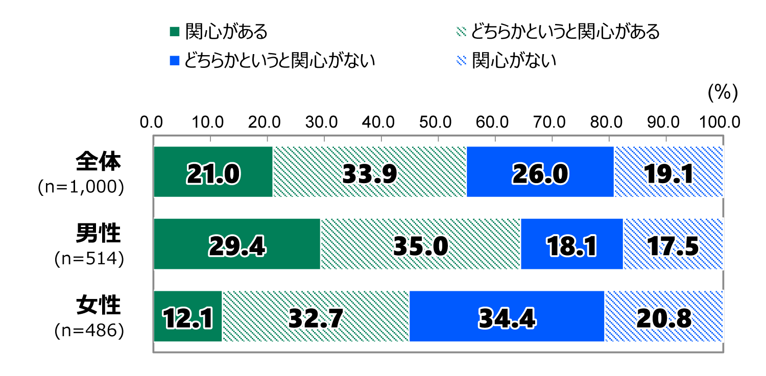 (※それぞれ「関心がある」+「どちらかというと関心がある」、「関心がない」+「どちらかというと関心がない」の値)