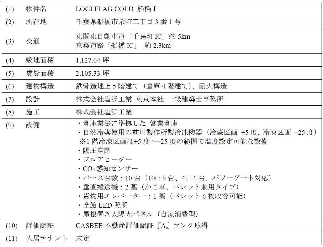 延床面積約2,105坪(冷蔵:568坪、冷凍:1,371坪、事務所等:165坪)のBOX型倉庫4層で、2030年のフロン規制を見据え、CO₂を用いた自然冷媒の冷凍機を使用しており、環境に配慮した冷凍冷蔵倉庫となっております。