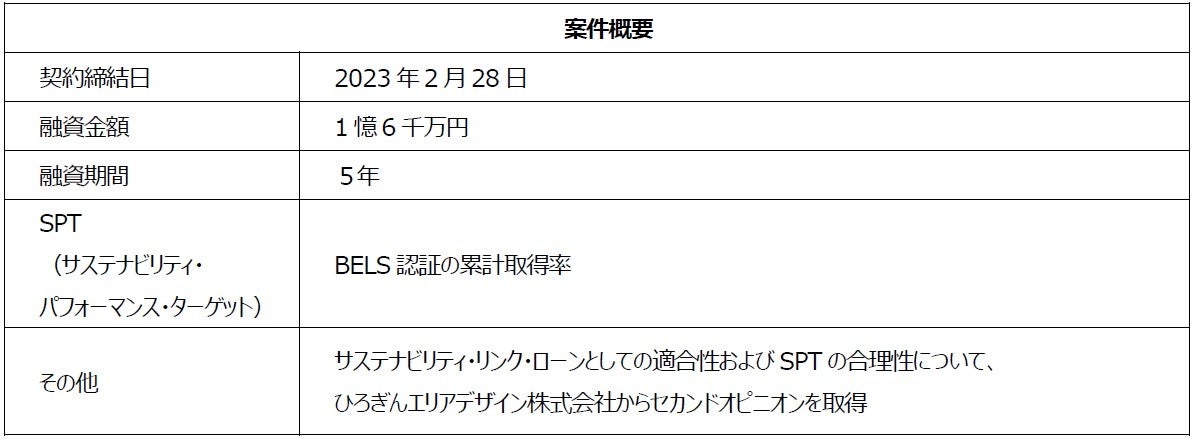 広島銀行の「サステナビリティ・リンク・ローン」は、企業がESG・SDGs に関する目標を設定し、達成した場合に金利が引き下げられ、設定した目標等にかかる外部レビューと年1回のレポーティングが必要となるサステナブルローンです※。2022年1月に当社「区分所有オフィス」の「VORT®」シリーズ20物件について、建築物省エネルギー性能表示制度 BELS認証(Building-Housing Energy-efficiency Labeling System)を取得し、環境不動産(グリーンビルディング、ESG不動産)の促進にも注力していることが、今回の資金調達における評価につながりました。※広島銀行のサステナブルローンについては別紙1参照