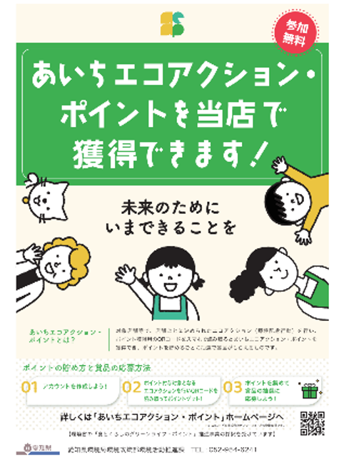 加店舗等において対象のエコアクションを実践した場合に、店舗等に設置するQRコードをスマートフォンで読み取ることで集められる愛知県独自のポイントです。300ポイント集めていただくごとに、1万円の