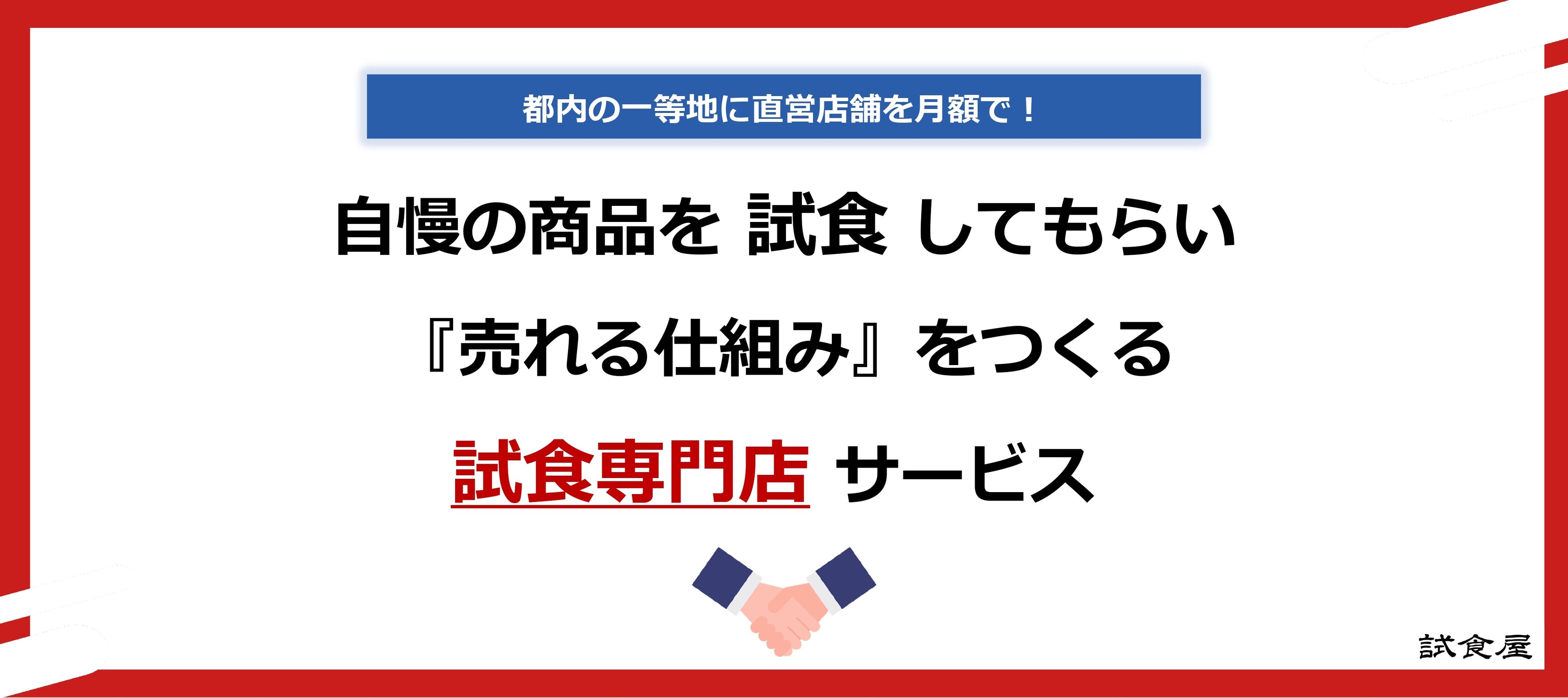 試食屋では、「味やこだわり」に自信がある企業を募集しています。弊社で商品審査をさせていただき、期間や価格を相談してから導入決定という流れになります。首都圏の「本当に良いもの」を探されている消費者に対して、 食品/飲料の本質である味で勝負することが可能です。問い合わせは下記連絡先までお願いいたします。