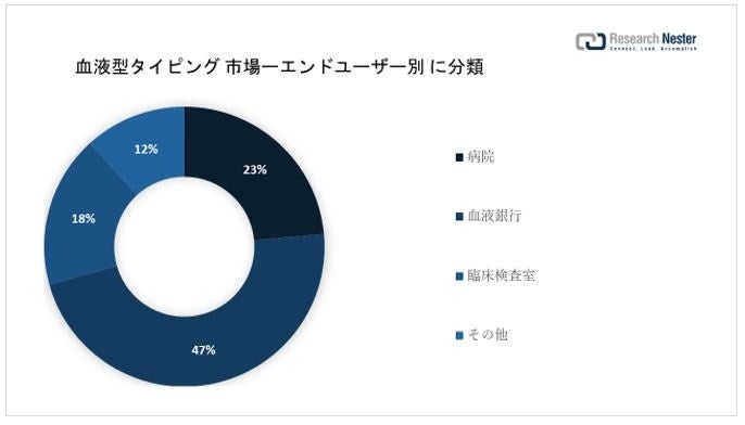 世界の血液型タイピング市場は、病院、血液銀行、臨床検査室などのエンドユーザーごとに需要と供給について分割および分析されています。これらのセグメントの中で、血液銀行セグメントは、世界の血液型タイピング市場で最大の市場規模を獲得すると予想されています。 この増加は、献血銀行とセンターの数の増加、臓器移植、臓器置換手術の増加、世界中での C セクションの増加によるものです。