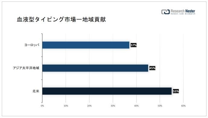 北米地域の血液型タイピング市場は、他のすべての地域の市場の中で、血小板と輸血成分の必要性の高まりに支えられて、2033年末までに最大の市場シェアを保持すると予測されています。さらに、有利な償還政策の利用可能性、効果的な治療のために血液型決定を必要とする慢性疾患の症例の増加、および感染症の高い有病率は、予測期間中にこの地域の血液型タイピング市場の成長を促進すると予想されます。
