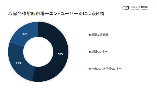 世界の心臓発作診断市場は、病院と診療所、診断センター、外来および外科センターへのエンドユーザーによる需要と供給についてセグメント化および分析されています。エンドユーザーに基づいて、病院および診療所セグメントは、予測期間にわたって注目に値する成長を目撃すると予測されています。 このセグメントの成長は、病院環境で行われる外科的処置の数が多いこと、および世界中に存在する病院の数が多いことに起因しています。