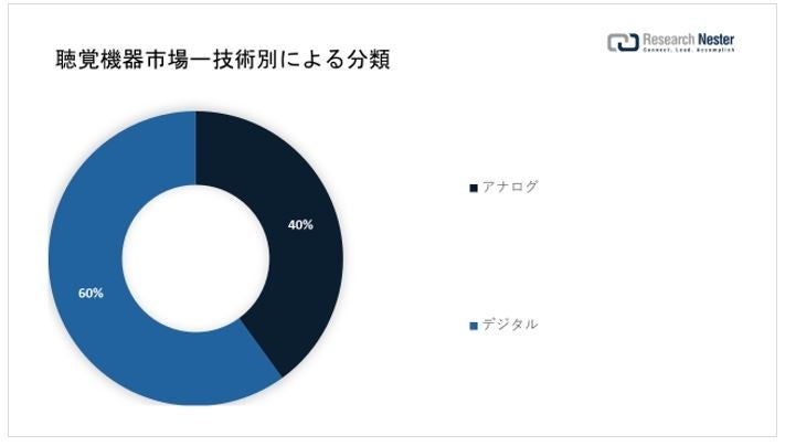 世界の聴覚機器市場は、アナログとデジタルへの技術別の需要と供給についてもセグメント化および分析されています。これら 2 つのセグメントの中で、デジタル セグメントが大きなシェアを獲得すると予想されます。このセグメントの成長は、高度なデジタル補聴器の需要を高めている補聴器のデジタル化と自動化の増加に起因する可能性があります。一方、アナログセグメントは、技術的に強化されたマイクを使用して強烈なサウンドを生成するため、予測期間中に顕著なCAGRが見られると予測されています。