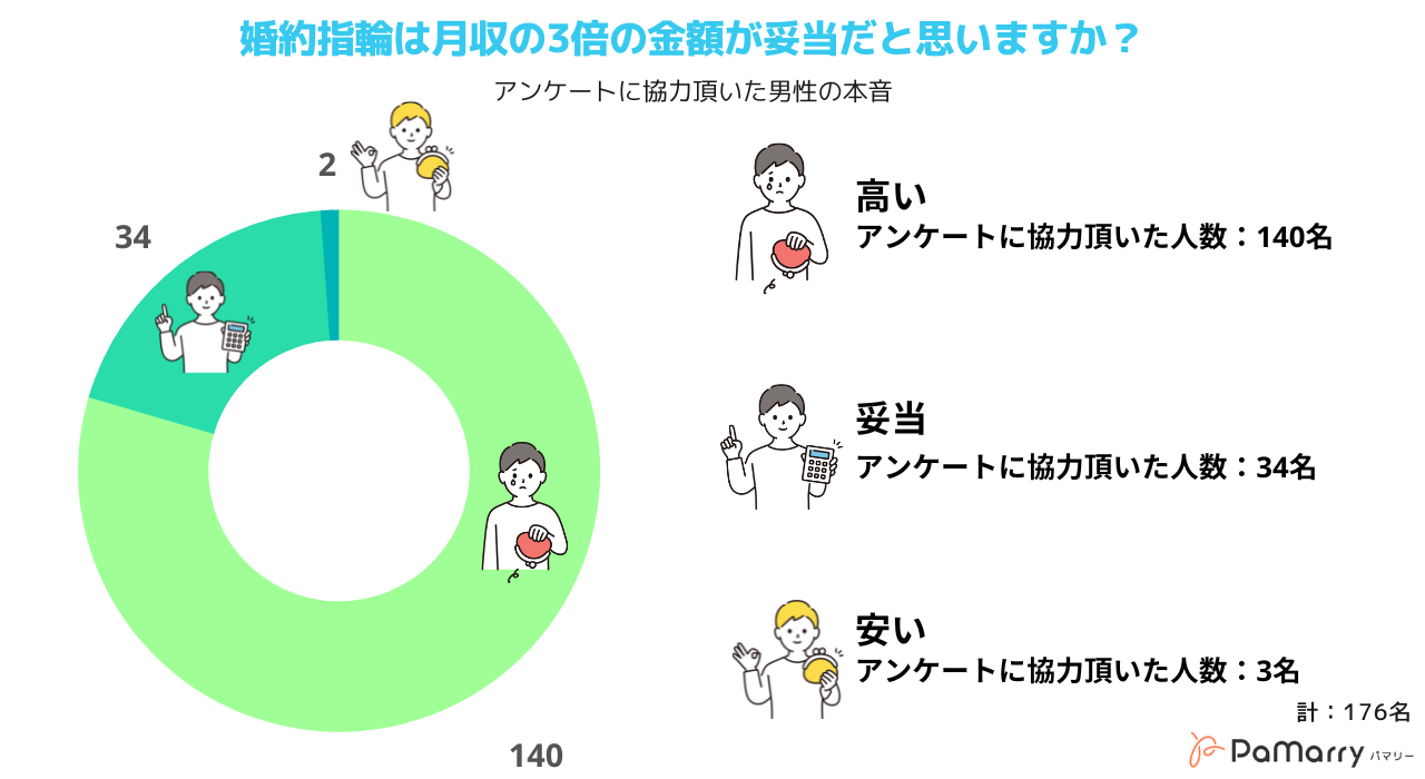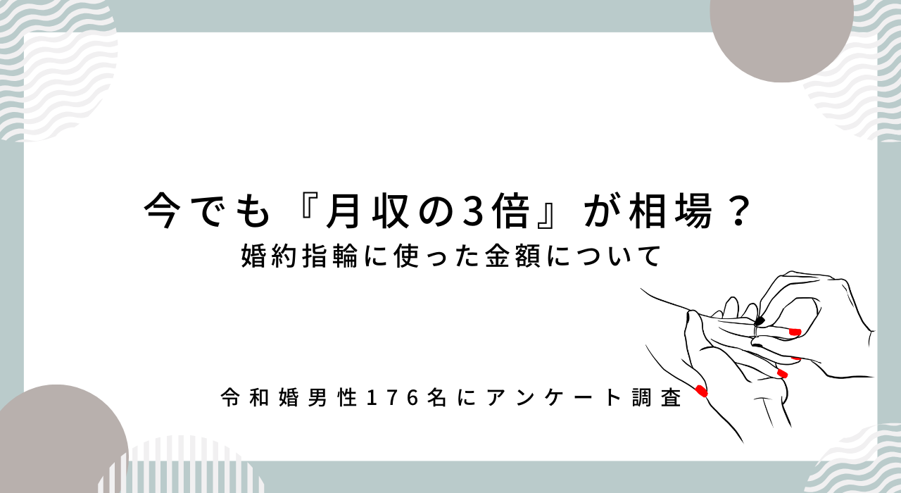 本記事では、令和に結婚(令和婚)でも「婚約指輪の月収の3倍相当の金額が妥当か?」男性176名を対象にアンケート調査を実施いたしました。