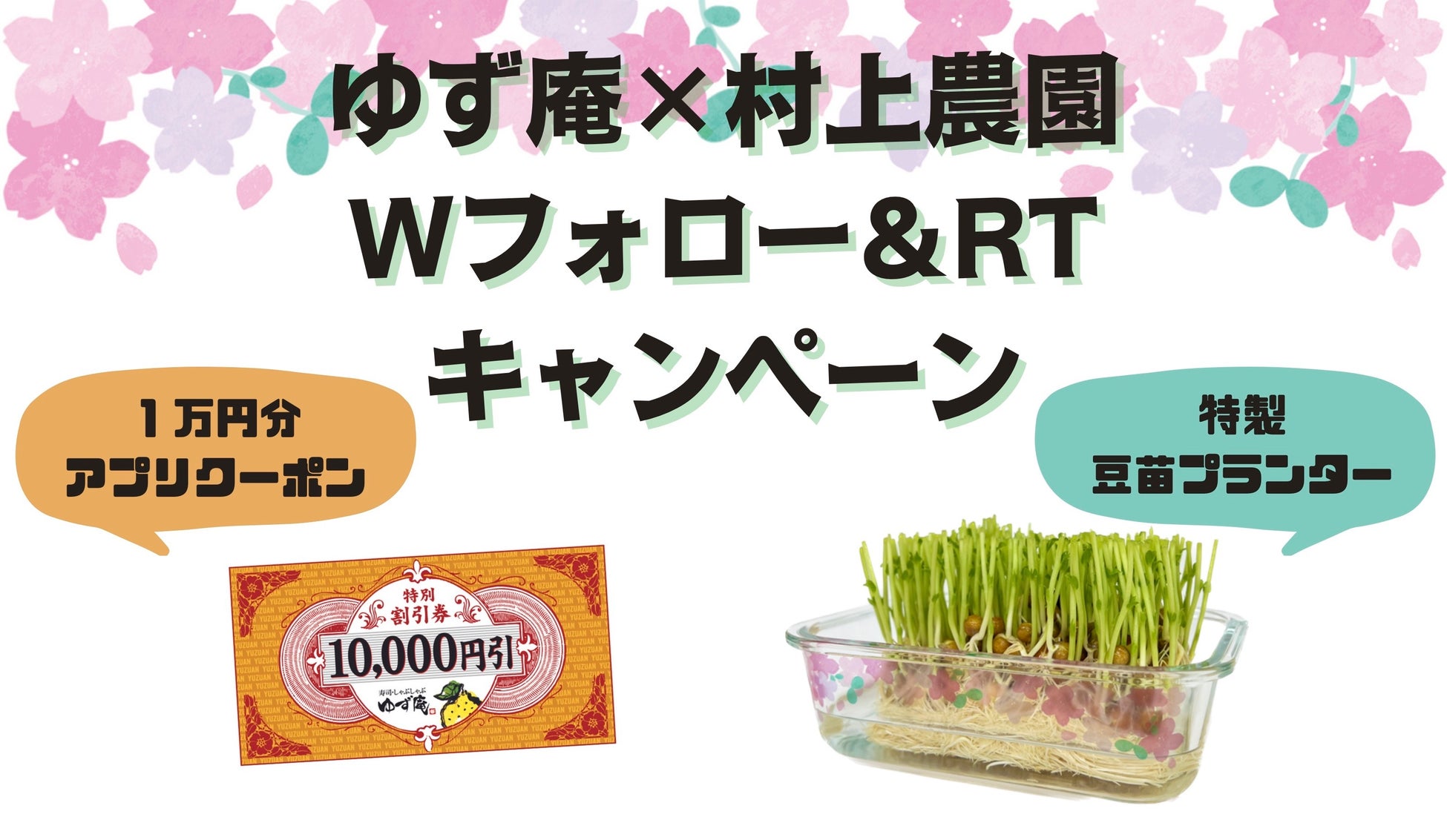 これを記念して、3月1日(水)からTwitterのWフォロー&リツイートで豪華賞品が当たるプレゼントキャンペーンを開催。第1弾はゆず庵のアプリクーポン1万円分、第2弾は桜と豆苗のイラストが入った特製豆苗プランターと、豆苗・スプラウトの詰め合わせをプレゼントします。