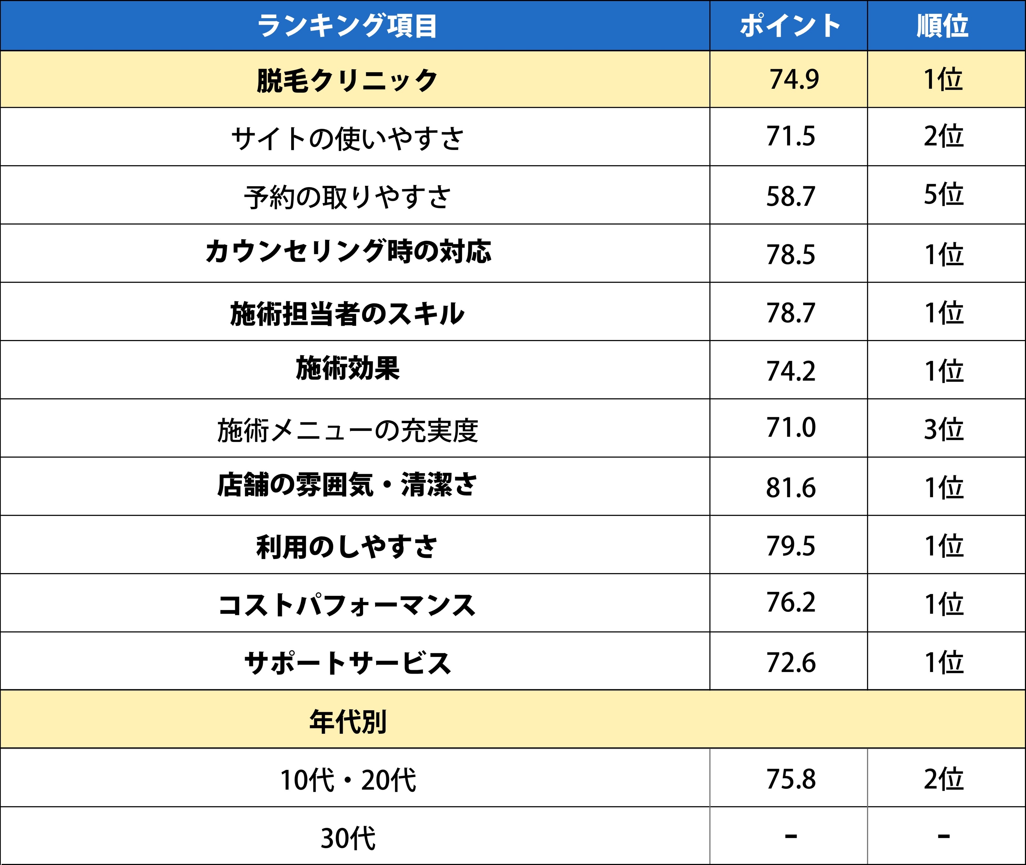 今回の調査において、「フレイアクリニック」は、評価項目10項目中下記7項目で1位を獲得しました。