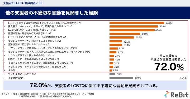 支援者の72.0%が、支援のなかで他の支援者の不適切な言動を見聞きしています。支援現場の多くがLGBTQの相談者/利用者にとって安心して利用できる場ではなく、利用に際して困難を経験する状況であると考えられます。上位項目として「LGBTQに関する知識や理解が不足していると感じられる言動があった(52.5%)」「男女欄や「さん・くん」分けなど、不要な男女分けをしていた(46.4%)」「LGBTQがいないことを前提に支援をしていた(43.4%)」などが挙げられました。LGBTQの相談者/利用者も存在する事実を知り、基本的な知識や意識を身に付けることで改善できる項目が上位となっています。