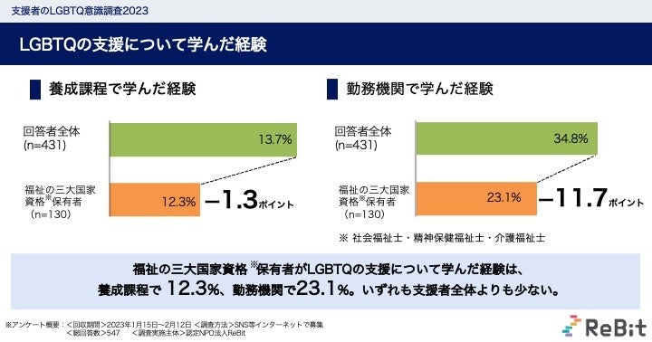 社会福祉士・精神保健福祉士・介護福祉士の国家資格保有者のうち、LGBTQの支援について「養成課程で学んだ経験がある者」は12.3%、「勤務機関で学んだ経験がある者」は23.1%です。福祉の専門職を育成する養成課程の多くで、LGBTQの支援について知識を得る機会が提供されていない状況が明らかになりました。