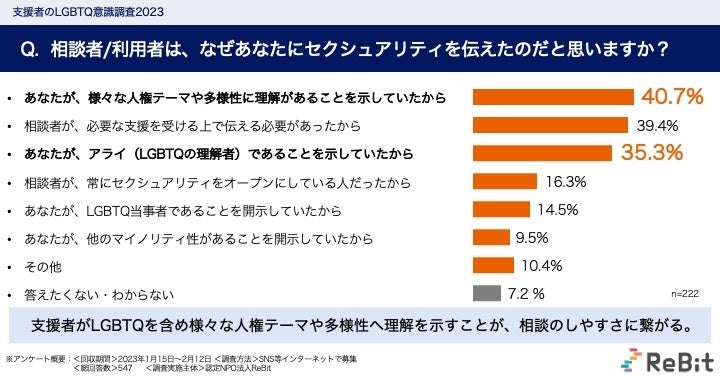 なお、相談者/利用者が支援者にセクシュアリティを伝えた理由は、支援者が「様々な人権テーマや多様性に理解があることを示していたから」が最も高く40.7%で、「アライ(LGBTQの理解者)であることを示していたから」が35.3%です。支援者が支援現場で日常的にLGBTQを含めさまざまな人権テーマや多様性への理解を示すことが、相談のしやすさに繋がると考えられます。