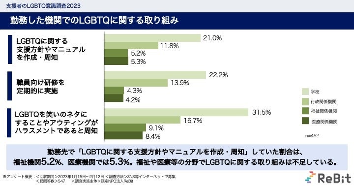 勤務した支援機関で「LGBTQに関する支援方針やマニュアルを作成・周知」していた割合は、福祉関係機関で5.2%、医療関係機関で5.3%と、取り組みが不足しています。「職員向け研修を定期的に実施」していた割合や「LGBTQを笑いのネタにすることやアウティングがハラスメントであると周知」していた割合も、学校や行政関係機関と比較して、福祉や医療等関係機関の割合はいずれも低いことが分かりました。支援がなければ生存が危ぶまれる場合もある福祉や医療等の現場で、他の支援現場よりも取り組みが遅れている状況です。