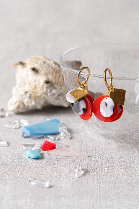ペットボトルキャップをアップサイクルしたイヤリングです。使い捨てのプラスチックについて考えるきっかけになりますように。