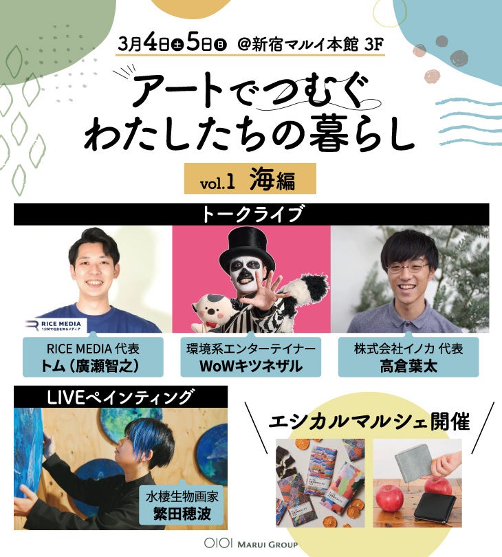 「アートでつむぐわたしたちの暮らし」はどなたでも参加しやすく、また気軽に楽しくサステナブルを体験できるイベントです。第1回目となる今回は、3月5日の”サンゴ日”にちなんだ「海」がテーマのイベント「アートでつむぐわたしたちの暮らし~vol.1海編~」を開催。ライブペイントやトークショーなど楽しいコンテンツをご用意しています。