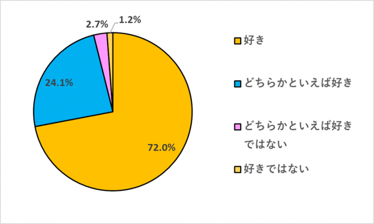 「いちごは好きですか?」の質問に対し、「好き」が72.0%、「どちらかといえば好き」が24.1%と、合わせると96.1%の人が、いちごが好きなことが分かりました。