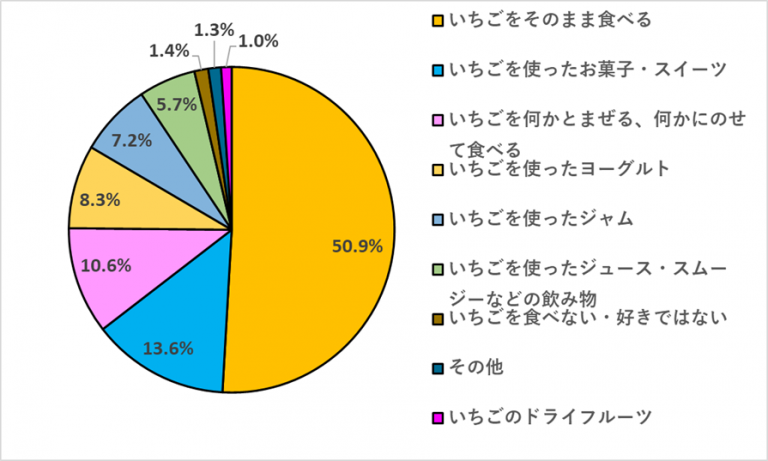 「いちごをどのようにして食べますか?」という質問を複数回答可で行ったところ、「いちごをそのまま食べる」が50.9%、次いで「いちごを使ったお菓子・スイーツ」13.6%、「いちごを何かとまぜる、何かにのせて食べる」が10.6%という順になりました。いちごはそのままでも甘くて美味しいですので、そのまま食べる食べ方も人気のようですね。