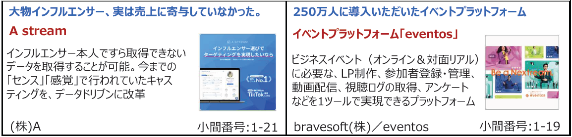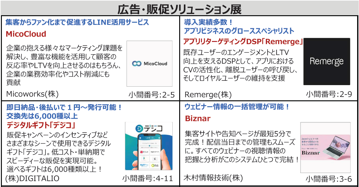 アドテクノロジー、PRコンテンツ制作、WEBメディア構築、販促支援、情報発信プラットフォーム、などを持つ企業25社が出展。