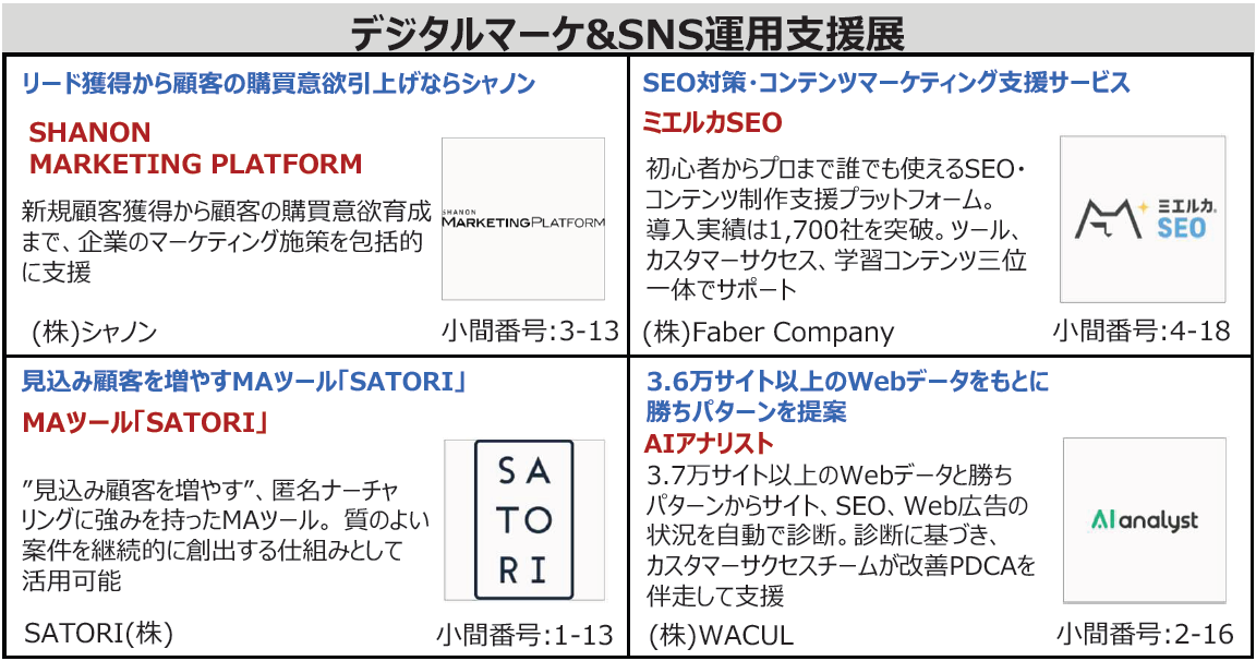 MA(マーケティング・オートメーション)、WEBサイト分析・改善、コンテンツマーケティング、SNSマーケティングなどを持つ企業25社が出展。