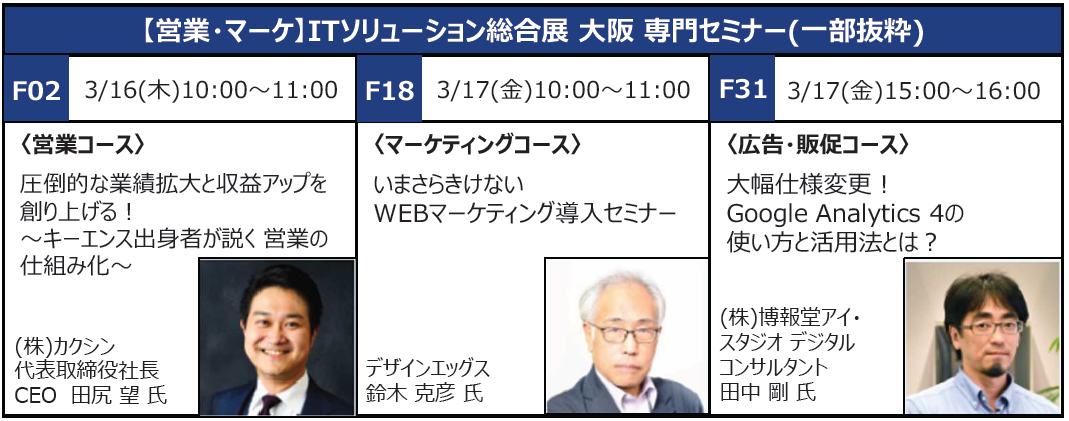 本展では、業界の有識者を講師に招いた「専門セミナー」も同時開催する。営業コースでは、キーエンス出⾝の(株)カクシンCEO 田尻望氏が、業績拡大と収益アップを実現する営業の仕組み化を公開する他、マーケティングコースでは、デザインエッグス鈴木克彦氏が、中小企業のWEBマーケティング導入について解説するセミナーなど、営業・マーケ・販促部門のプロはもちろん、売上アップ・生産性向上を目指す経営者必聴のセミナーが多数開催される。