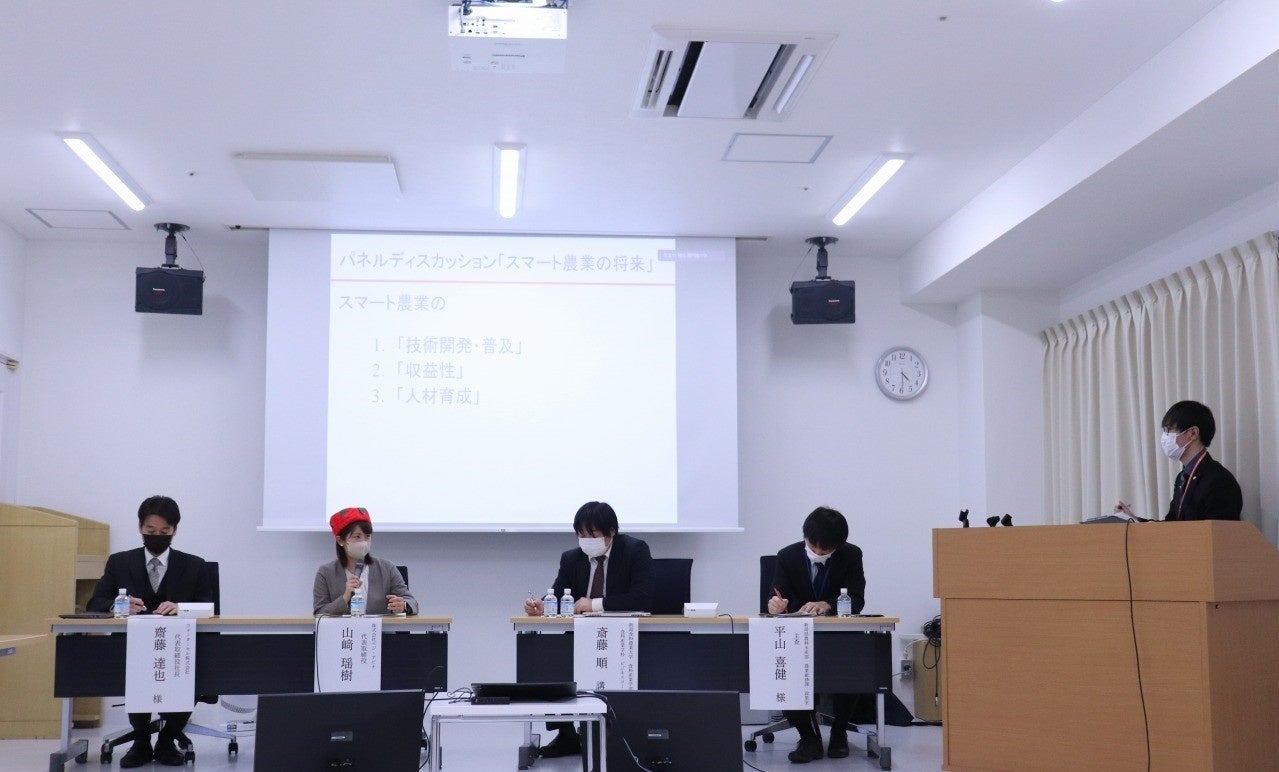 産業界と連携し、様々な業界の第一線で活躍するビジネスパーソンをゲストに招いて行っている開志コラボセミナー。第12回となった今回は、新潟食料農業大学(2022年度 第3回 アグロフードセミナー)との共催で「新潟におけるスマート農業の取り組み」をテーマに、2023年2月13日(月)、本学紫竹山キャンパスでの対面およびオンラインで開催されました。前半は招待講演、後半はパネルディスカッションを通じ、新潟・全国における農業の課題や現状、スマート農業がもたらす可能性について等、幅広いテーマについて意見交換が行われました。