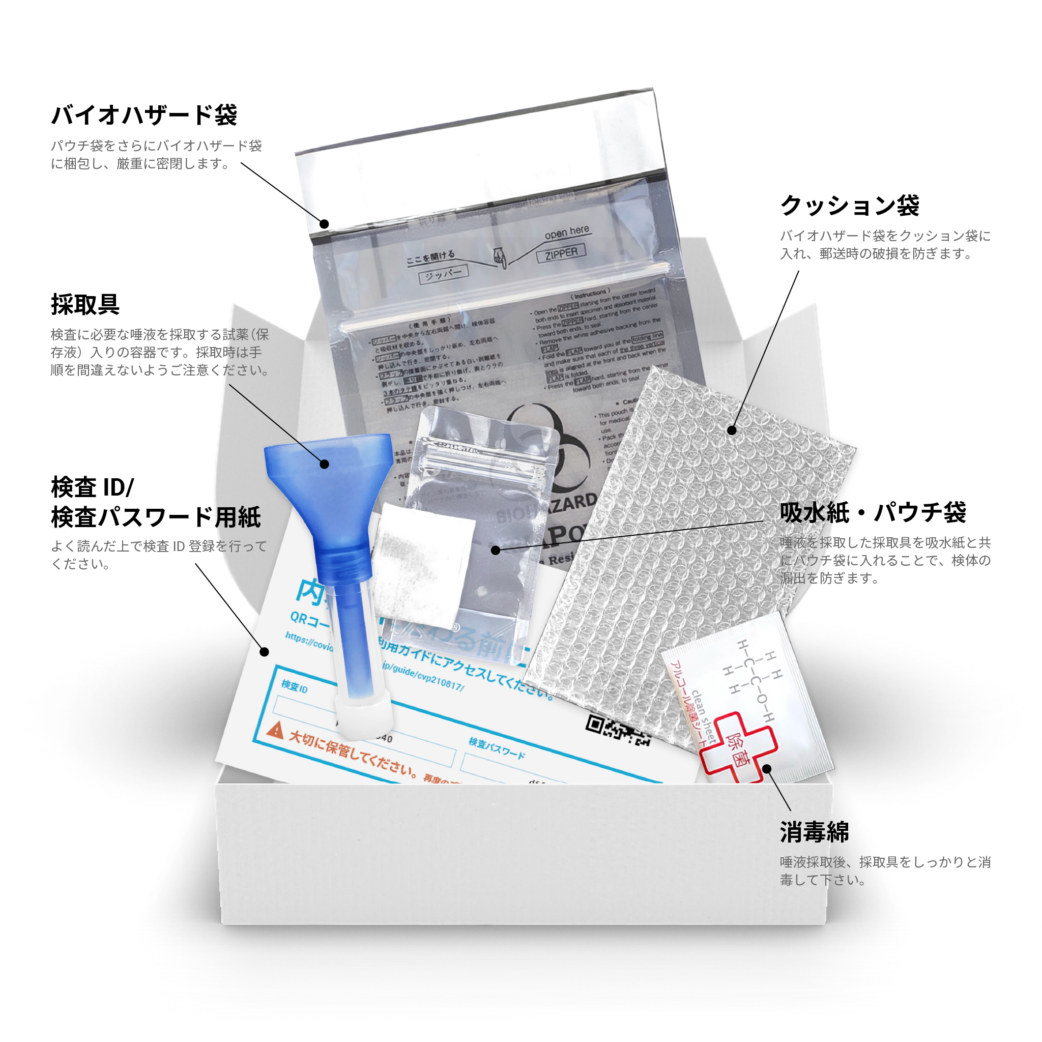 1回の唾液採取で、ご自宅や職場にいながらにして、ジェネシスヘルスケアの衛生検査所に安全に検体を郵送することができます。当社のRNA検体採取キットには、ウイルスを不活性化・安定化する保存液(試薬)が含まれているため、安全な取扱と輸送が可能です。また、検査結果はオンラインで提供されるため、利便性にも優れています。