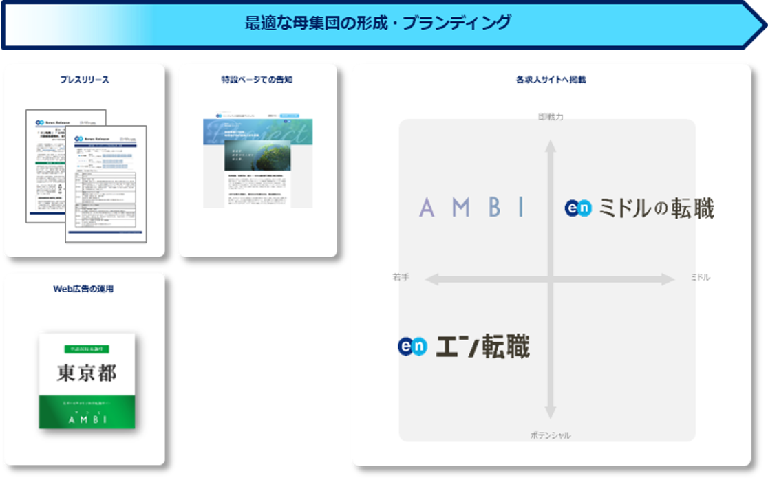 プレスリリースや特設ページ、採用HPの作成、Web広告を用いた告知に加え、各求人サイトでの集客サポートを実施いたします。『エン転職』『AMBI』『ミドルの転職』とターゲットの異なる3つの求人サイトを活用することで、ターゲットへ網羅的に求人を届けます。