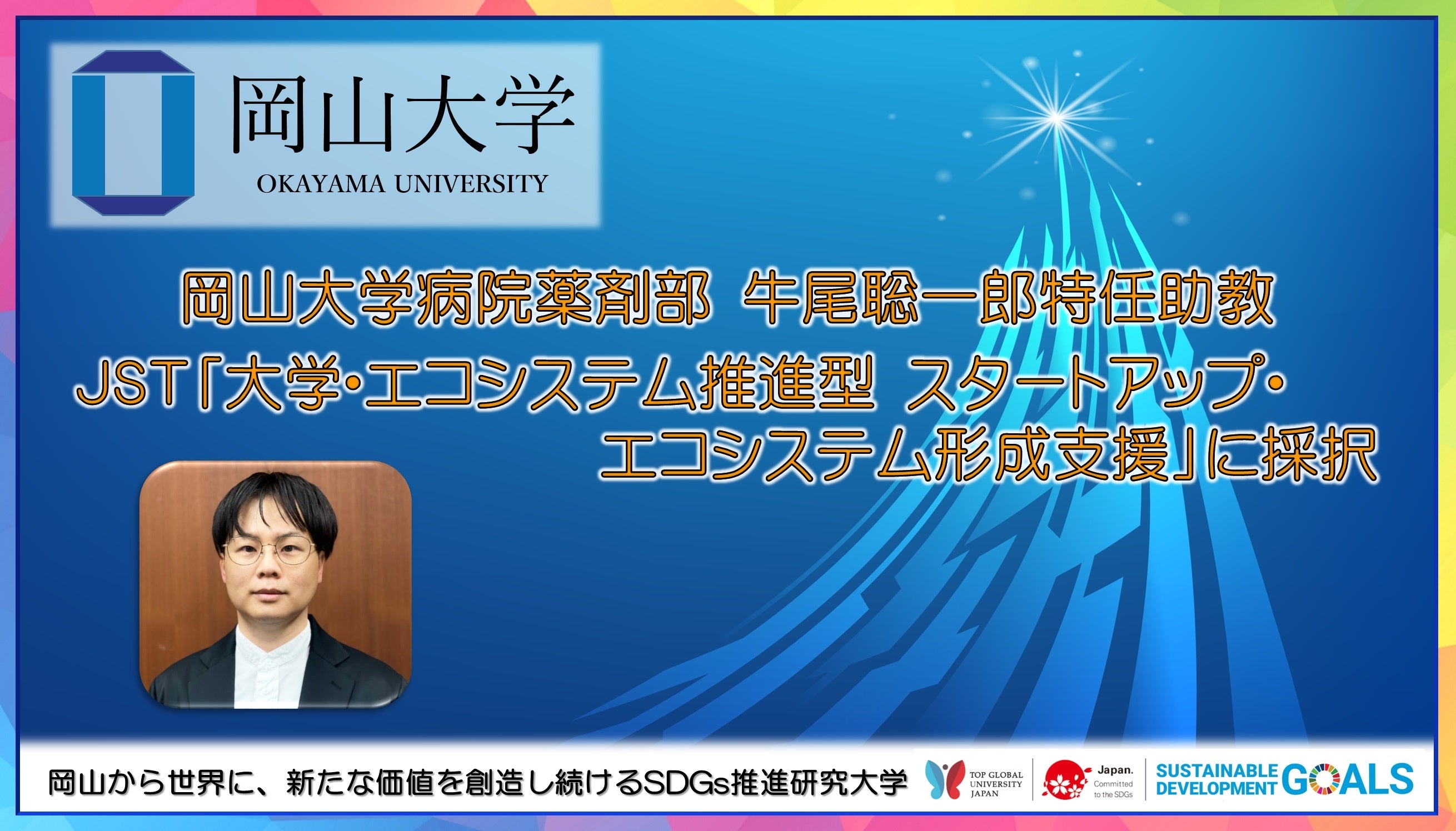 国立大学法人岡山大学(本部:岡山市北区、学長:槇野博史)の岡山大学病院薬剤部に所属する牛尾聡一郎特任助教が、国立研究開発法人科学技術振興機構(JST)の「大学・エコシステム推進型 スタートアップ・エコシステム形成支援(研究開発費:2,558万円)」に採択されました。