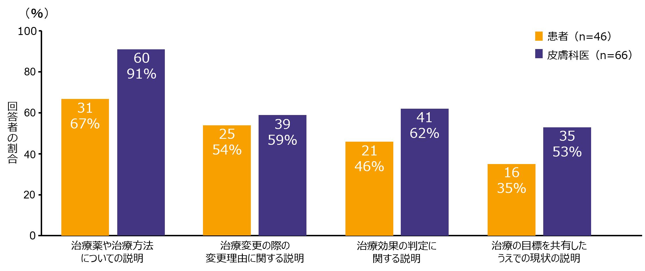 「治療薬・治療方法」は、医師は91%が説明している回答したのに対し、患者さんは67%でした。また、「治療の目標を共有した上での現状の説明」は、医師は53%が説明していると回答したのに対し、患者さんは35%という結果でした。<図4>