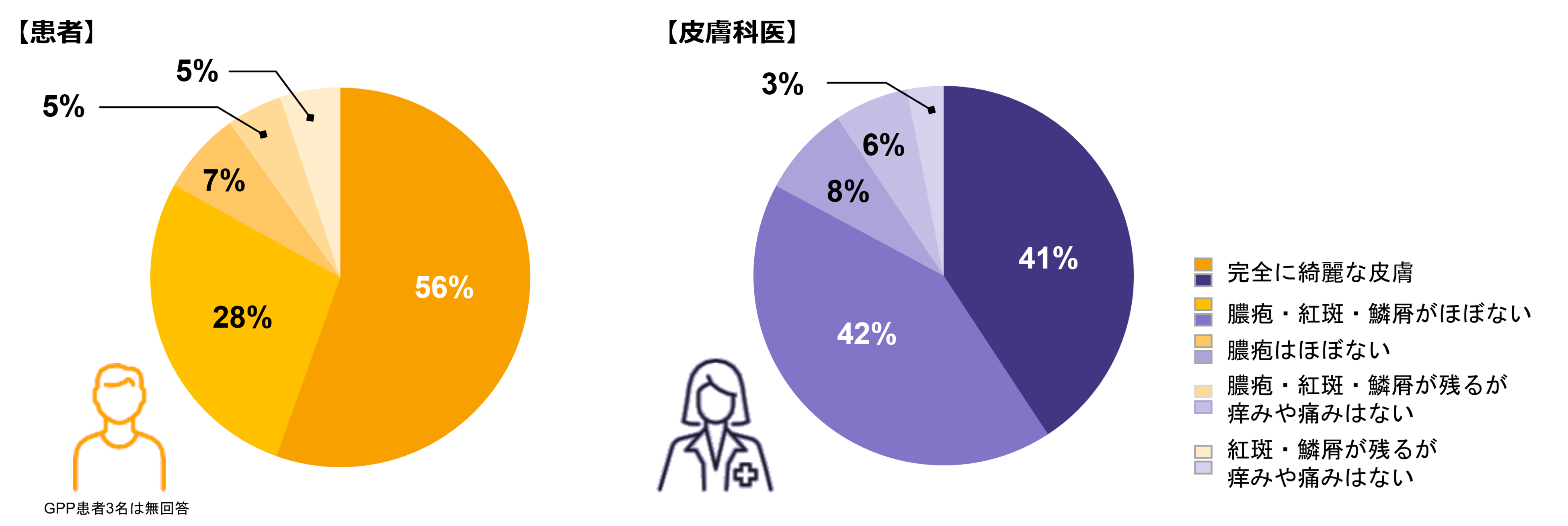 内訳をみると、患者さんが期待する状態として最も多かったのは「完全に綺麗な皮膚」(56%)に対し、医師が目指している状態は「膿疱・紅斑・鱗屑がほぼない状態」(42%)、「完全に綺麗な皮膚」(41%)でした。<図3>