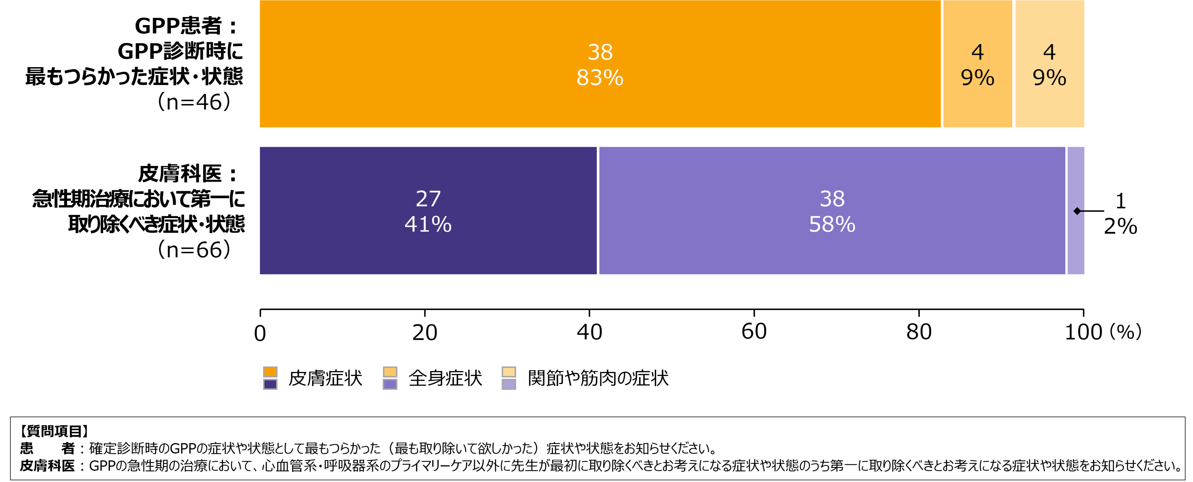 患者さんが診断時に最も辛かった症状として、膿疱(33%)や皮疹(28%)など、「皮膚症状」という回答が83%でした。一方、医師が第一に取り除くべきだと考える症状は、「全身症状」が58%(発熱や悪寒(52%)、全身の倦怠感(6%))と最も多くみられました。<図1>