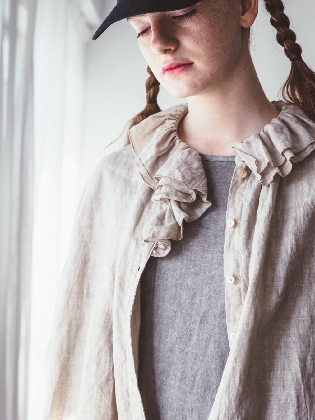 野菜の葉の重なりをイメージした2枚重ねのボリューミーな衿が印象的なブラウス。衿には、身頃よりやや薄手のリネン素材を使用し、軽やかに仕上げました。