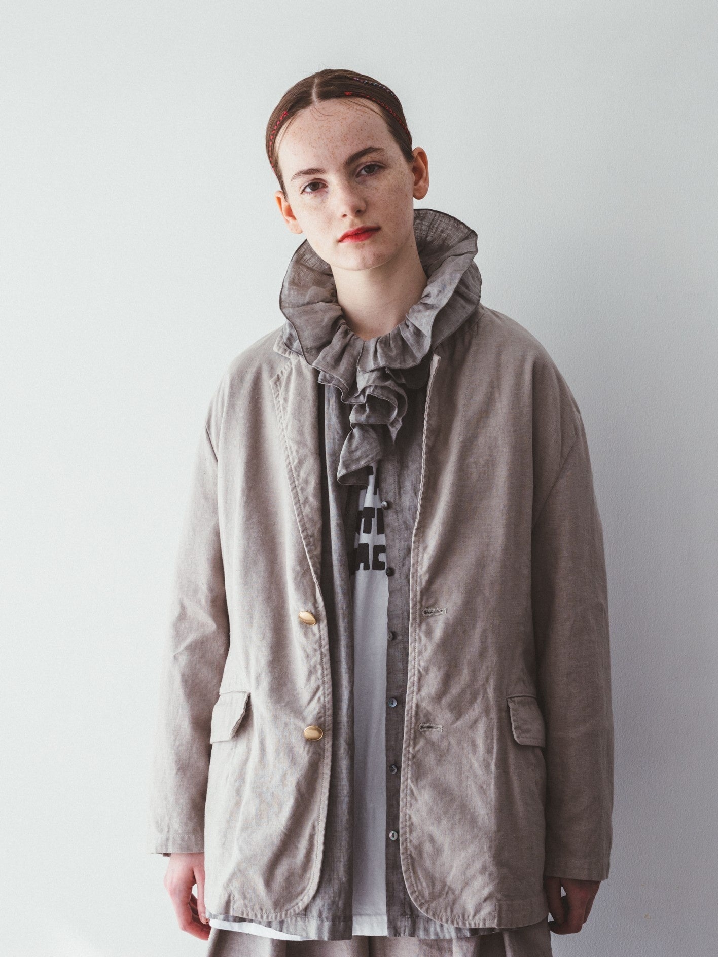 野菜の葉の重なりをイメージした2枚重ねのボリューミーな衿が印象的なブラウス。衿には、身頃よりやや薄手のリネン素材を使用し、軽やかに仕上げました。