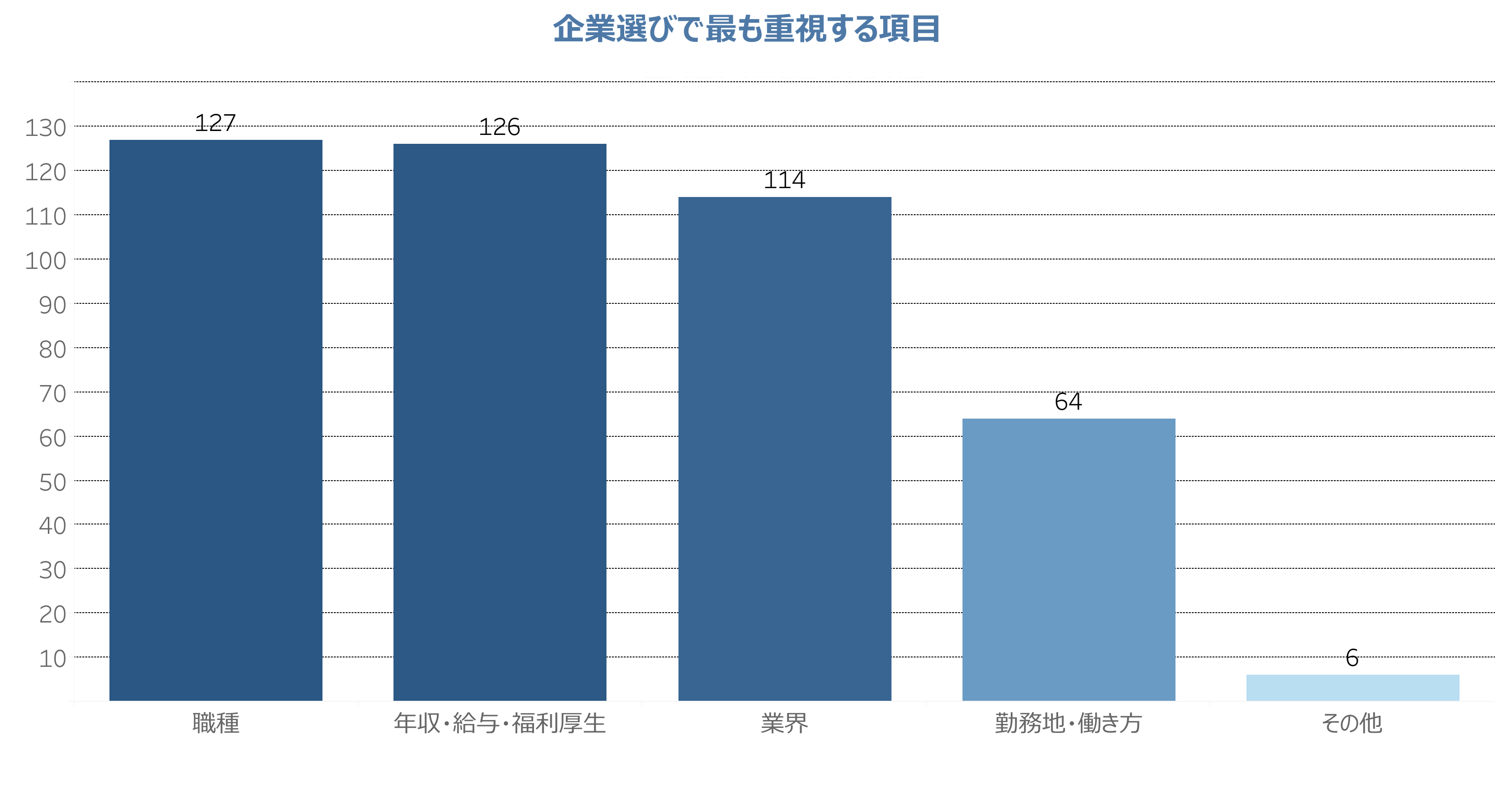 企業選びにおいて最も重視する項目を聞くと「職種」が最多となりました。「年収・給与・福利厚生」がほぼ同数で続きますが、職場の待遇を上回るほど「何の仕事をするか」を重視している人が多い結果となりました。これは「ジョブ型採用」の意識が学生側にも浸透している傾向にあると言えるかもしれません。