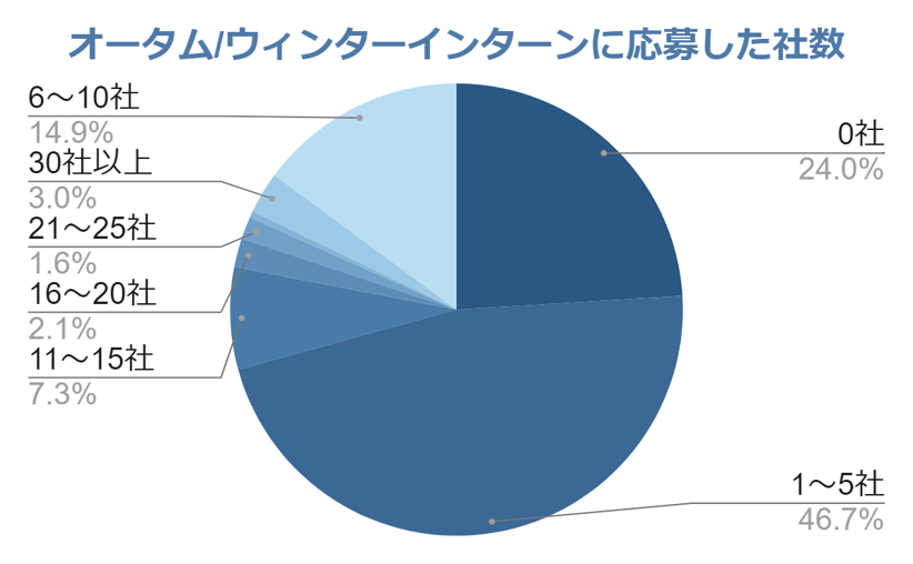 本選考前に行われるオータム/ウィンターインターンシップには回答者の76%が参加しており、一番多いのは1~5社の参加(46.7%)となりました。