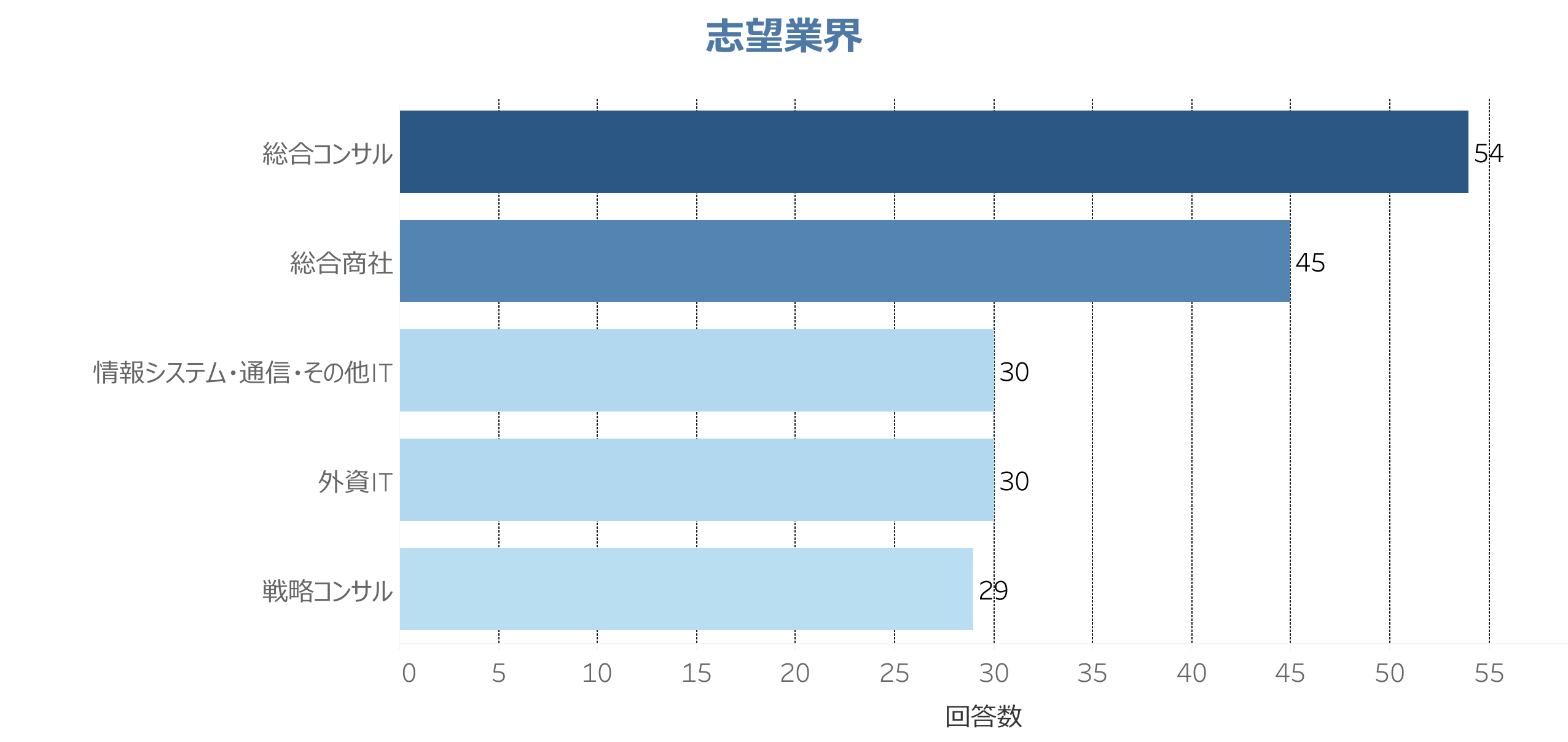 現在の学生の志望業界を聞くと、TOP5は「総合コンサル」「総合商社」「情報システム・通信・その他IT」「外資IT」「戦略コンサル」となりました。