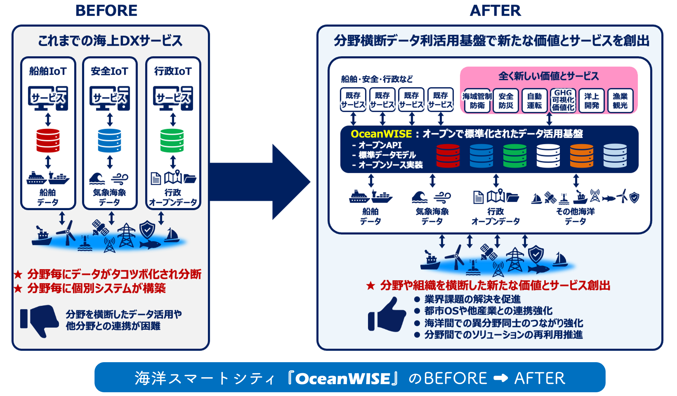 これまでサイロ化し点在していた海洋データは、OceanWISEのオープンで標準化されたデータ連携基盤によって、より簡単に、より早く、より確実に、より安全に利活用され、これまでに無い新しい価値とサービスが創出され、海洋が抱える課題の解決と産業の進化を促進させます。