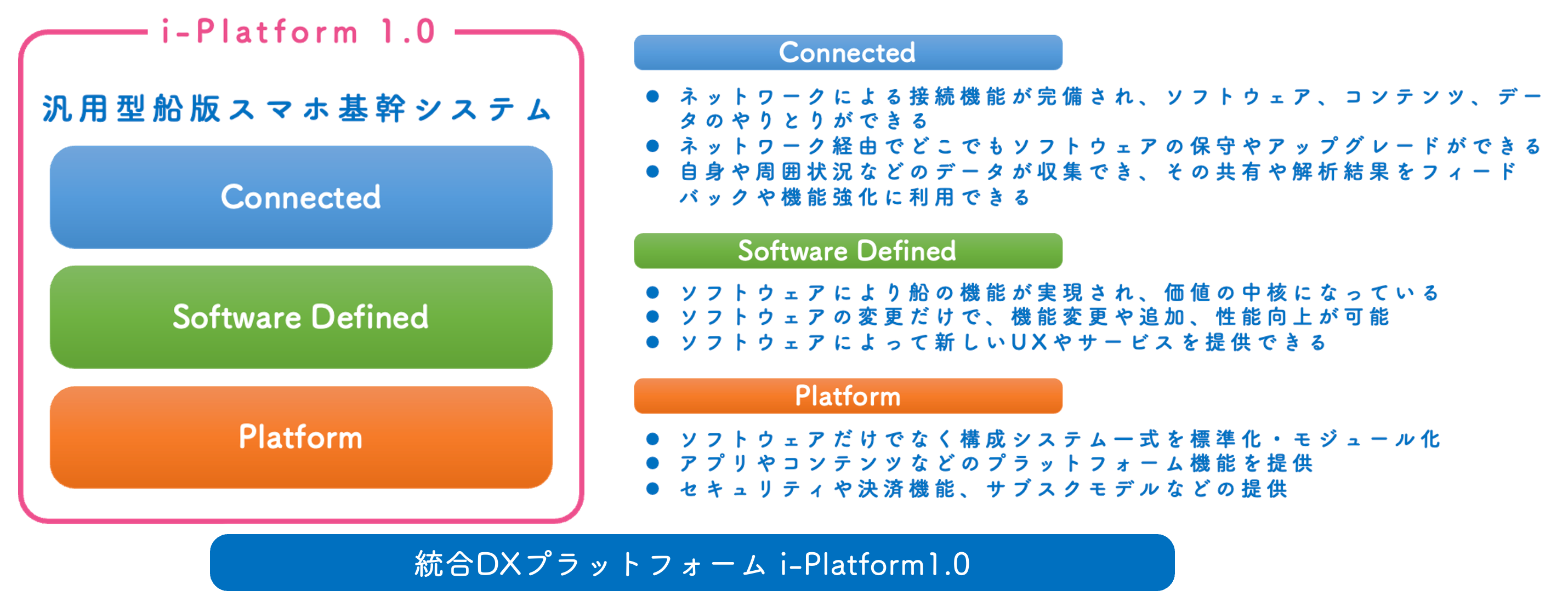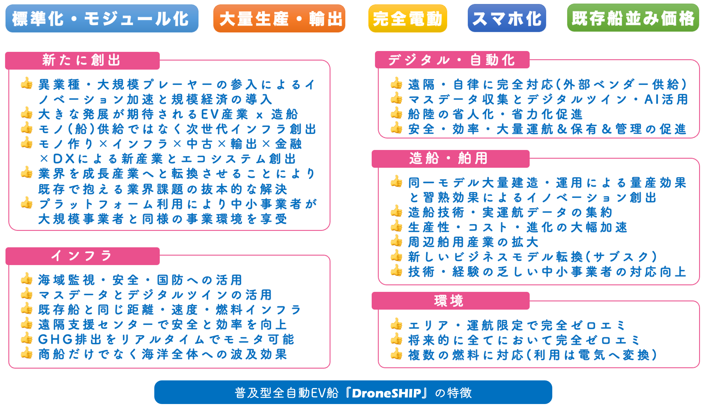 DroneSHIPの特徴は、船舶の単純なEV化ではなく、スマホ化と船版CASEにより創出される新しいインフラによって、業界が抱える課題の解決と、これまで無かった新たなチャンスや市場を創出します。