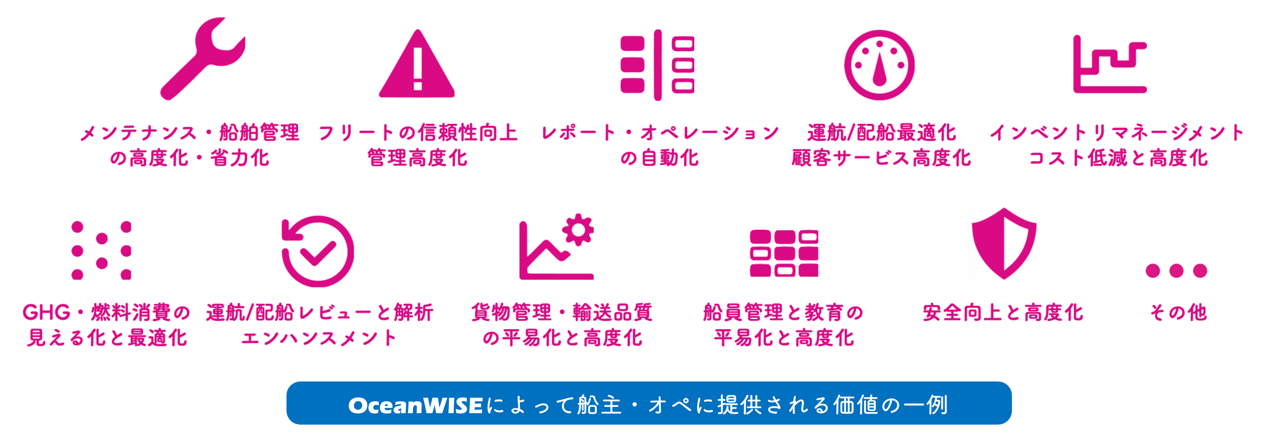 OceanWISEによって、これまで分野毎に分断されていたデータは海洋データ連携基盤=OceanWISEに集約され、業界課題である船舶の安全性向上や船員の労働環境改善はもちろん、カーボンニュートラル促進や自動運転社会実現に向けた新しい価値とサービスの実現が加速されます。