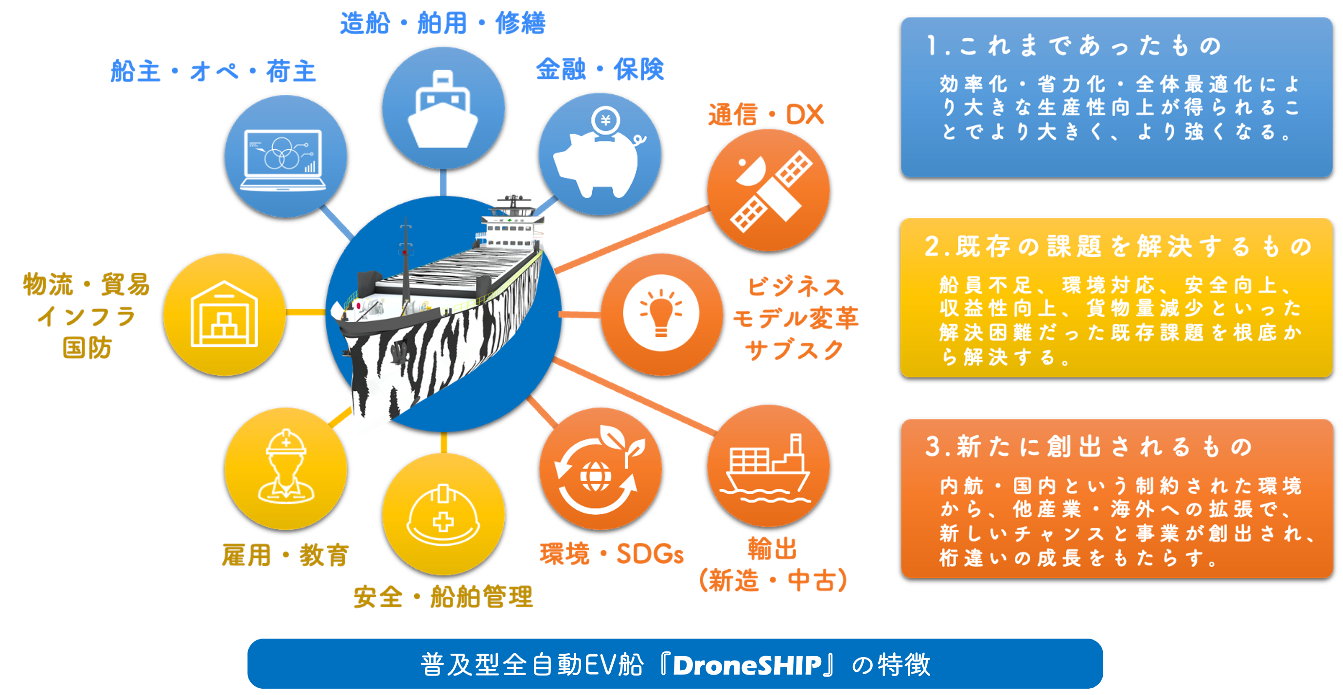 そのためには、EV船だけでなく、EV船によって新しい付加価値と市場拡張を引き起こすための全体最適化されたエコシステムそのものこそがDroneSHIPによって創られます。