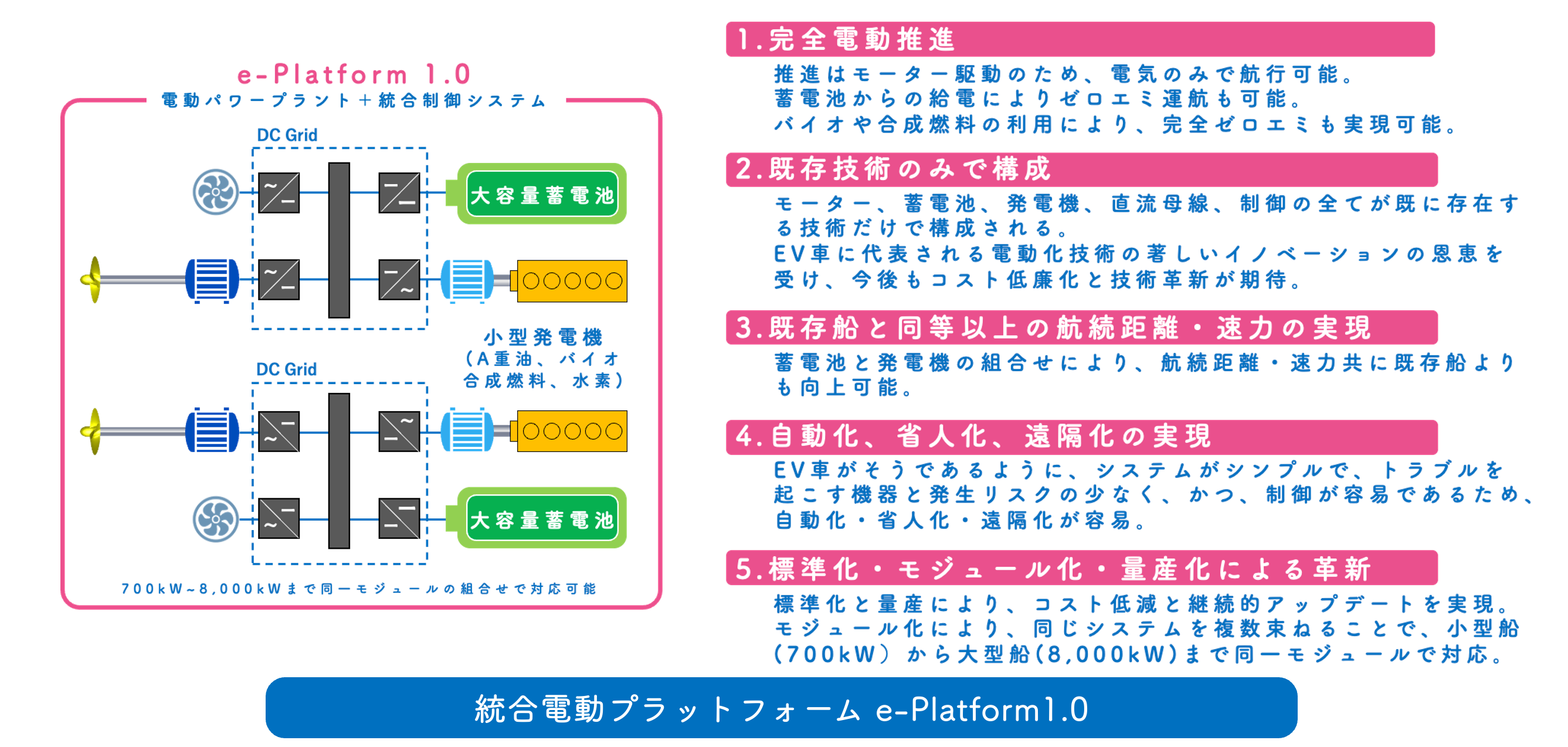 EV船の価格破壊のためには大量生産が必要であり、大量生産のために徹底的な標準化・モジュール化を進めていきます。EV船専用として設計・開発された船体、統合電動プラットフォーム「e-Platform1.0」、統合DXプラットフォーム「i-Platform1.0」によって、大量生産とコスト破壊、進化の加速へと繋げます。