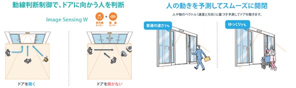 当社は、2011年に自動ドア業界で初めて*、センサーによる動線判断技術で不要な開閉を減らす自動ドアを開発し、2018年に『NATRUS+e』を発売しました。今回新たに発売する『NATRUS+e W』は、近赤外線方式と画像方式の2つのセンサーを組み合わせた動線判断機能を持つ『Image Sensing W』を搭載しています。当社従来製品に比べ新製品では動線判断エリアが約4倍に拡大し、通行者の動きをより的確に判断します(当社調べ)。ドアを通行する人のみに開閉し、不要な開閉を防ぐことで外気の流入を削減し、室内にいる人の快適性を保ちながら空調効率を高め、電力消費の削減に貢献します。