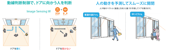 さらに、通行する人や物のベクトル(速度と方向)に基づき、ドアに到達するまでの時間を予測するため、車いすやベビーカーに対しても適切なタイミングでドアを開閉し、通行者にとってのストレスを低減します。誰にとっても使いやすい自動ドアを提供し、建物のバリアフリー化にも貢献します。