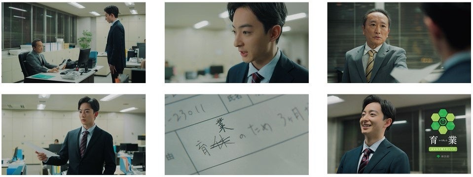 濱正悟さん演じる男性社員。意を決して部長に育休を申し出ます。「引継ぎはしっかりして、何かあれば電話で対応…」と必死に説明しますが、部長は渋い顔。申請書を突き返して「自分の仕事を心配しろ」と一言。申請書の文字は「育業」に修正されています。育児はパパの大切な仕事です。