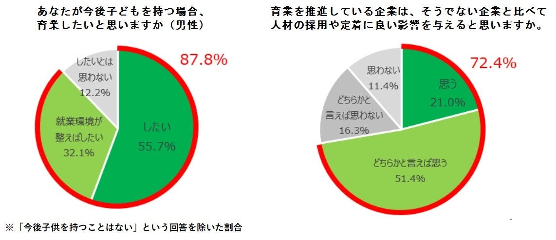 ・育業を推進する企業は、人材の採用や定着にプラスに作用すると考える人は、72.4%に上り、育業しやすい環境整備が人材確保にも影響する可能性を示唆しています。
