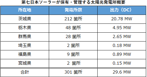 第七日本ソーラーは当社が設立した7番目の特別目的会社であり、北関東・東北地方を中心に301箇所、パネル出力で29.6MWの太陽光発電設備を保有・管理する太陽光発電事業者となります。