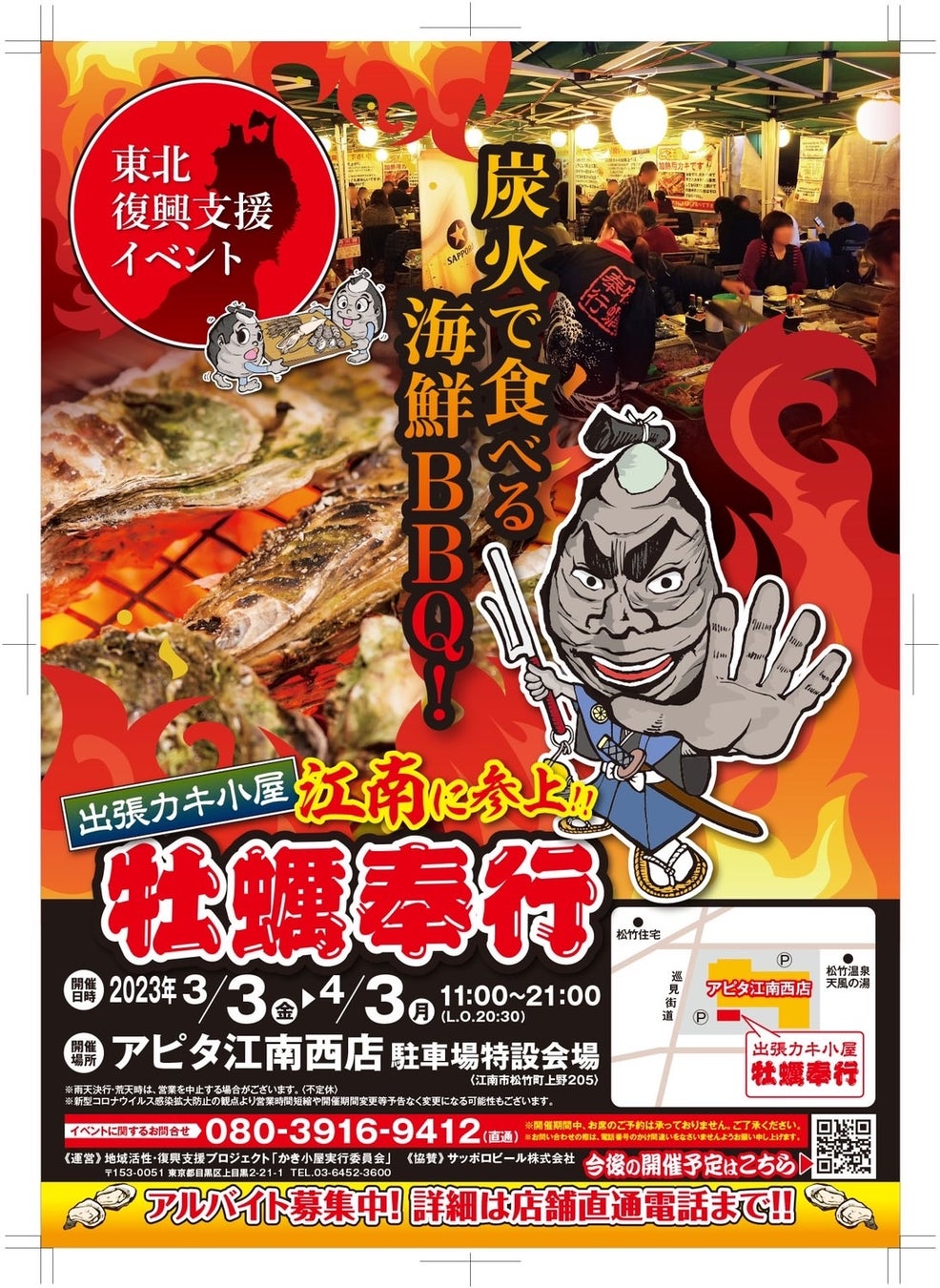 出張カキ小屋「牡蠣奉行」は東日本大震災で被災した宮城県石巻市の牡蠣を多くの人に食べてほしいと冬季限定の東北復興支援イベントとして全国各地で展開。4月3日(月)までの毎日営業。(荒天時休業、牡蠣売切次第閉店。)愛知県では稲沢市、名古屋市に続いての営業。