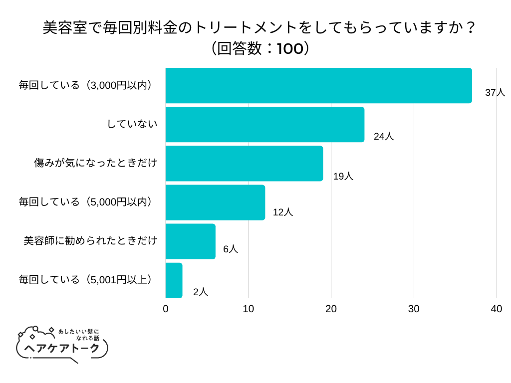 「美容室で毎回別料金のトリートメントをしてもらっていますか?」とアンケート調査した結果、1位は『毎回している(3,000円以内)』でした。