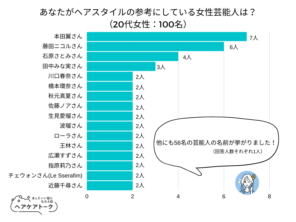 20代女性に「あなたがヘアスタイルの参考にしている女性芸能人は?」とアンケート調査した結果、1位は『本田翼さん』でした。